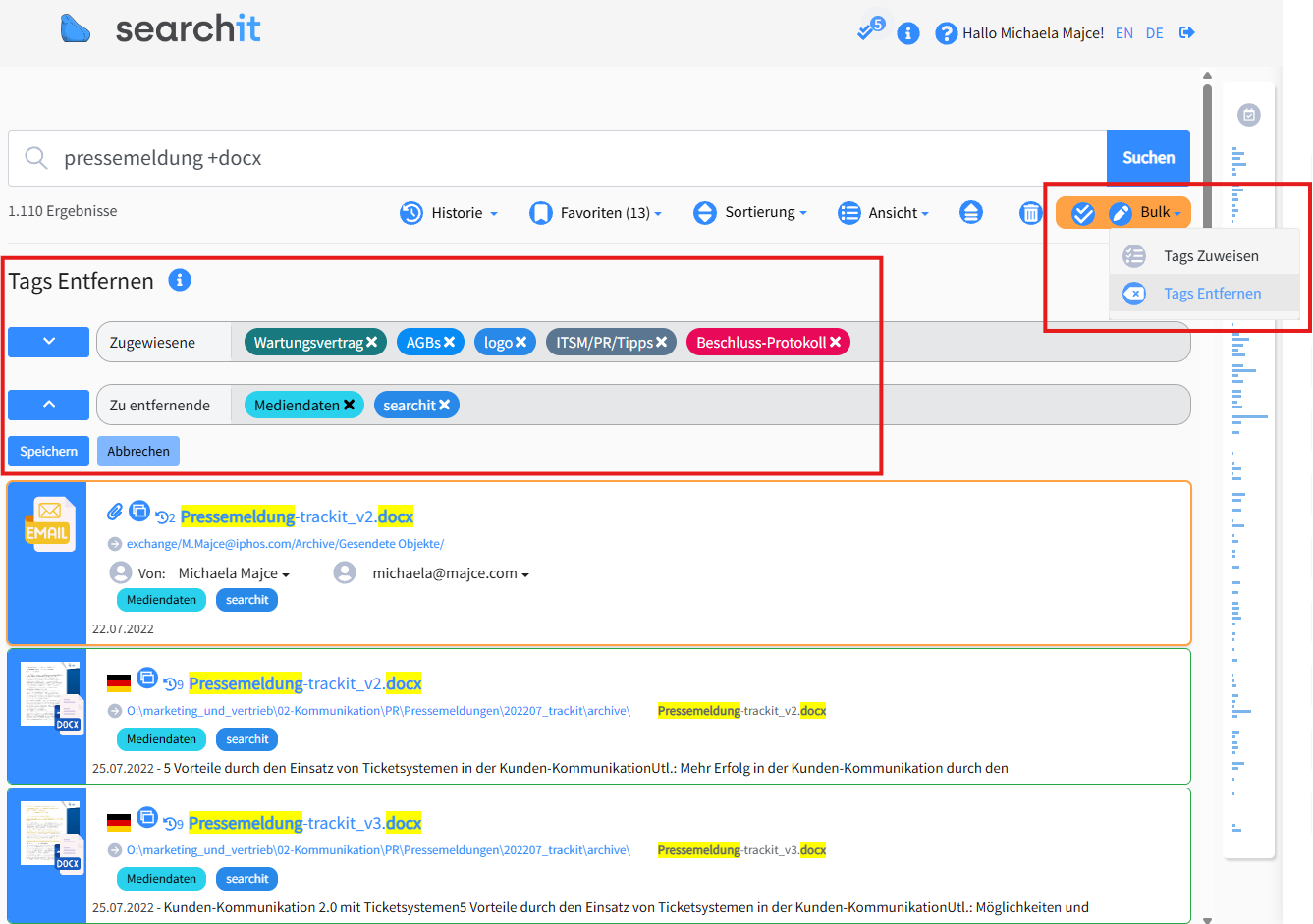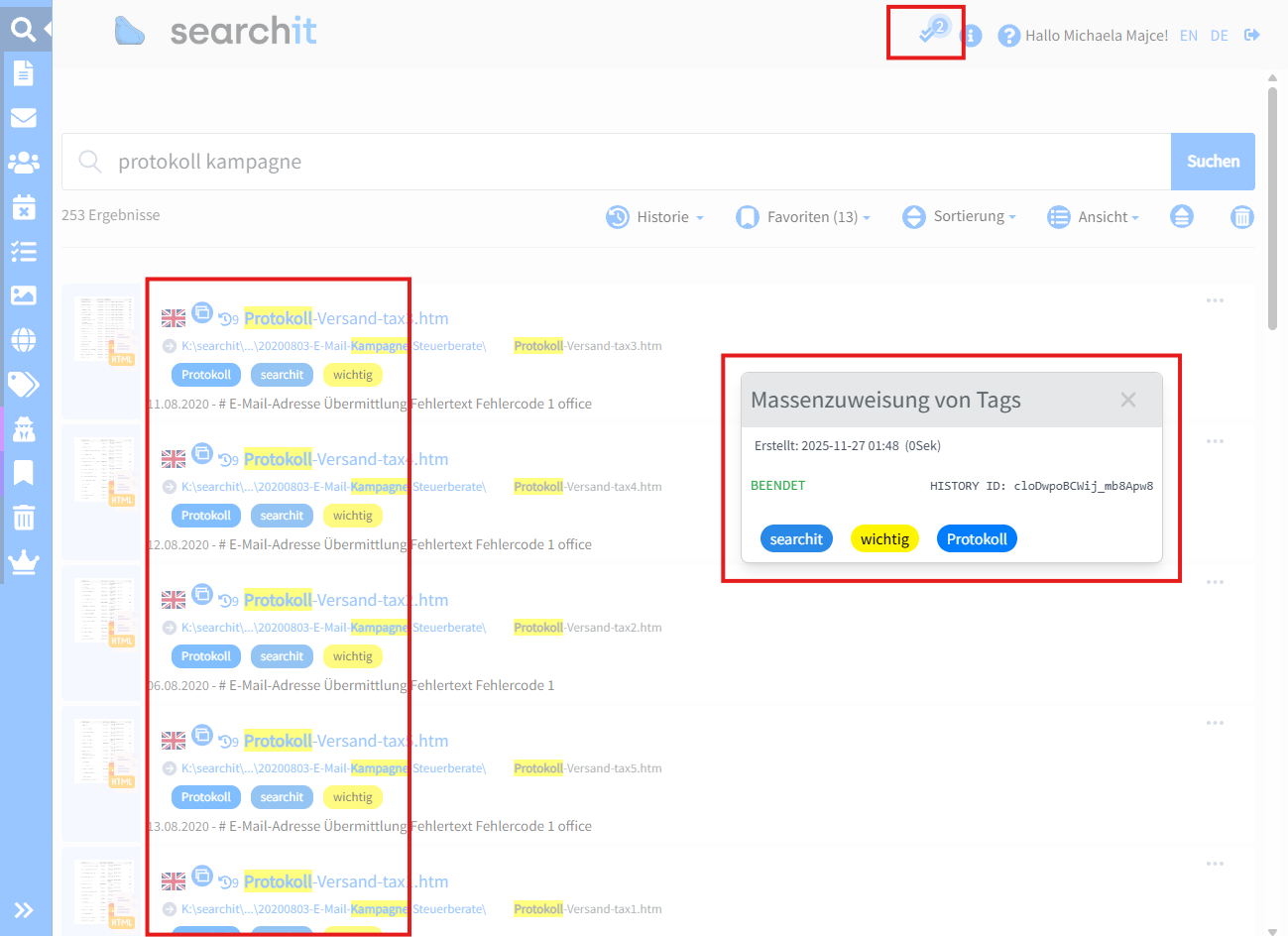 Bulk-Operationen ermöglichen es Ihnen, in searchit mehrere Dokumente gleichzeitig zu bearbeiten. Statt einzelne Dateien manuell zu öffnen oder zu markieren, können Sie mithilfe dieser Funktion eine Aktion – wie z. B. das Zuweisen oder Entfernen von Tags – mit nur wenigen Klicks auf eine Vielzahl von Treffern anwenden. Die Bulk-Zuweisung von Tags lässt sich auch mit der zuvor beschriebenen Gruppierung von Tags kombinieren, um schnell große Datenmengen zu strukturieren und Workflows abzubilden.