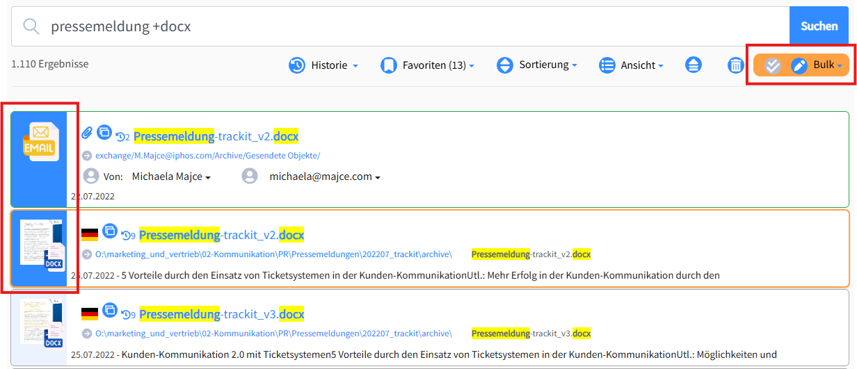 – Wählen Sie einzelne Dokumente gezielt per Mausklick aus. Durch gedrückte Strg-Taste können Sie wie im Explorer mehrere Treffer markieren oder abwählen. MIt Shift-Taste plus Mausklick können Sie eine fortlaufende Reihenfolge von Suchtreffern selektieren.