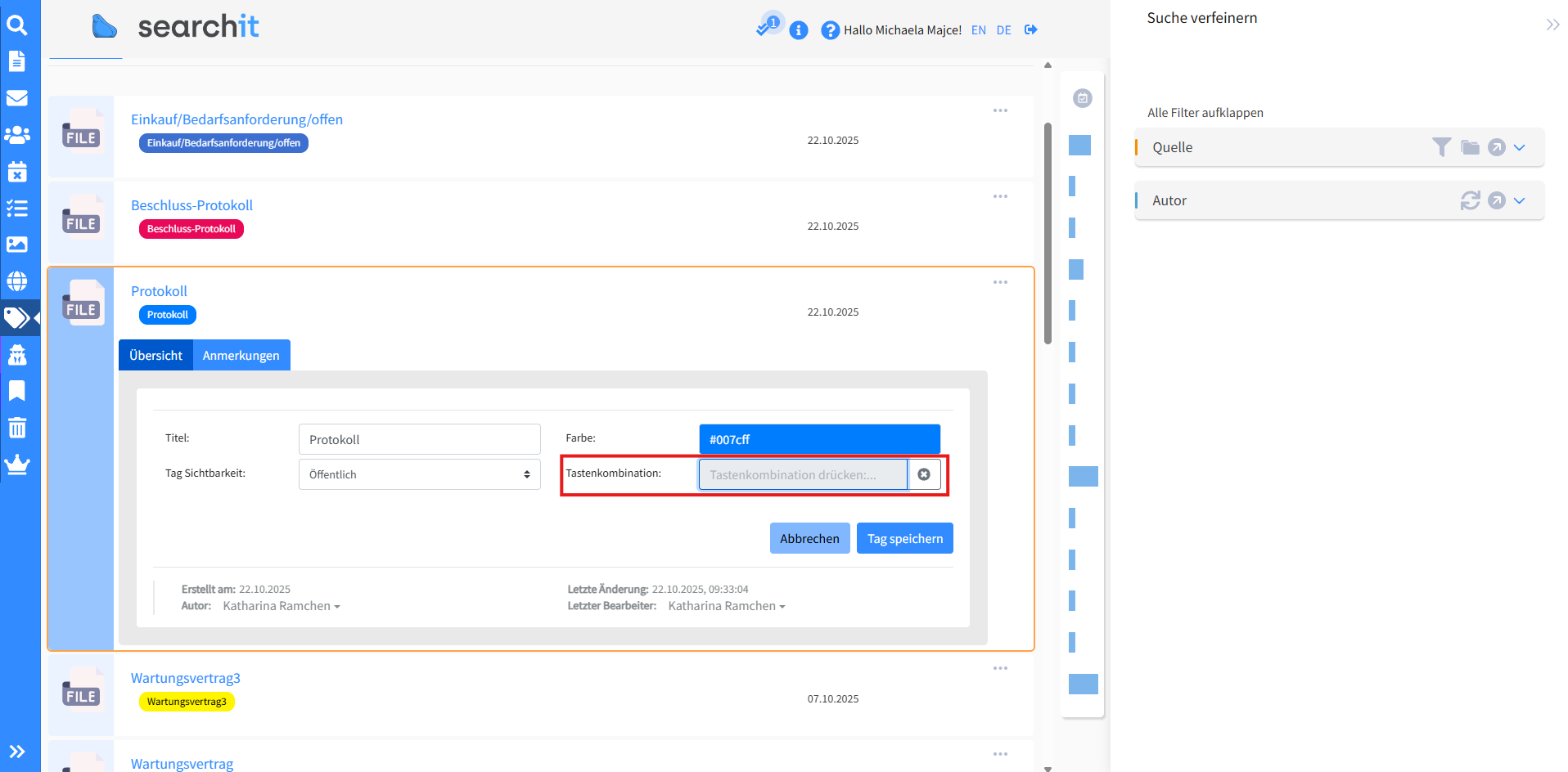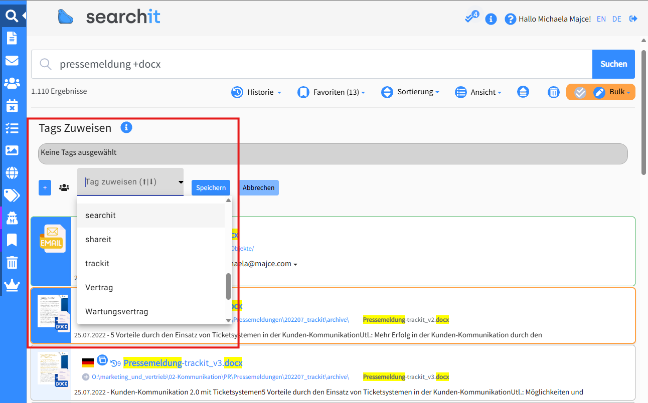 Wählen Sie Ihr vergebenes Tag in den Filtern aus, um die Seite zu refreshen und die neu zugeordneten Treffer anzuzeigen.