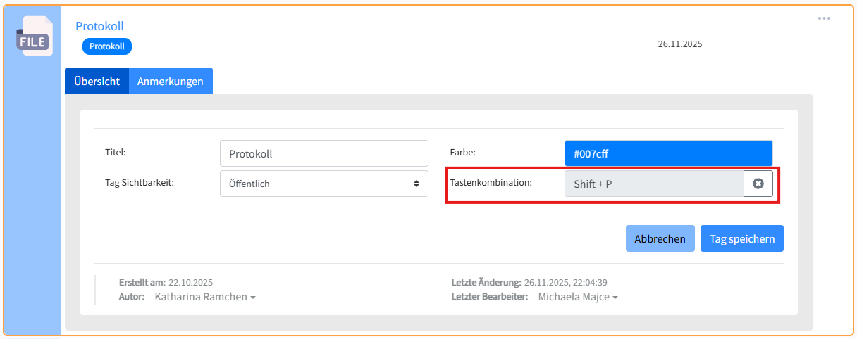 Sie legen fest, dass Shift+p automatisch das Tag „Protokoll“ vergibt.