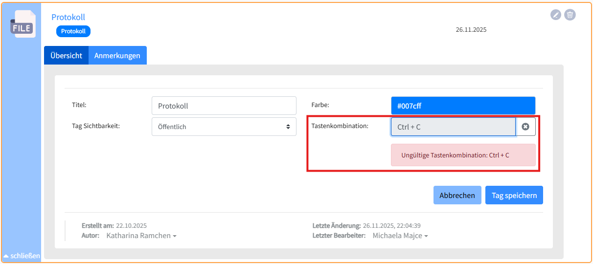 Beim Speichern prüft das System, ob die gewählte Tastenkombination bereits vergeben wurde oder mit systeminternen Befehlen kollidiert.