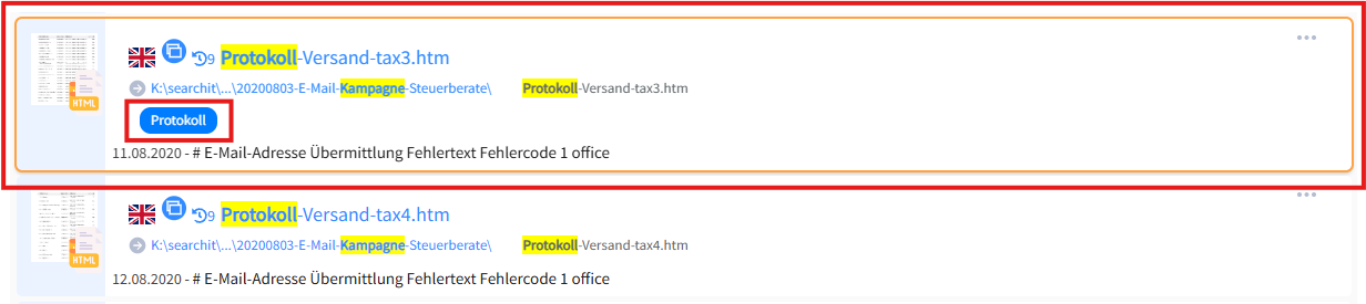 • Selektierte Treffer sind an der blauen Markierung links zu erkennen.