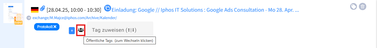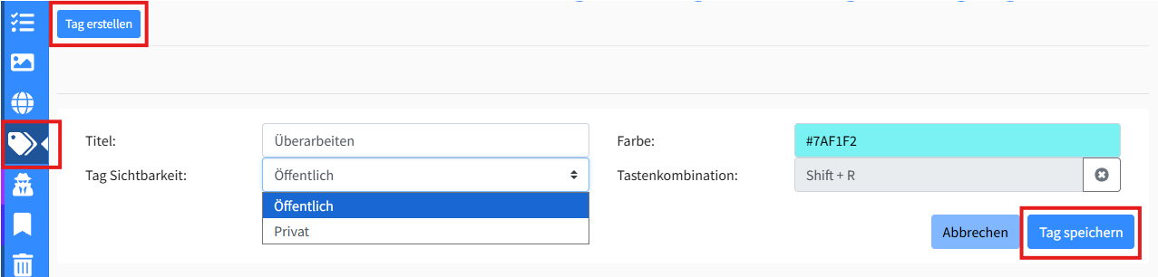 Beim Anlegen von Tags können Sie nicht nur über das Dropdown-Menü zwischen privaten und öffentlichen Tags wählen. Auch der kleine Icon-Button (siehe Screenshots) ermöglicht Ihnen, bequem zwischen den beiden Optionen zu wechseln. Standardmäßig ist dabei die Auswahl auf öffentliche Tags gesetzt.