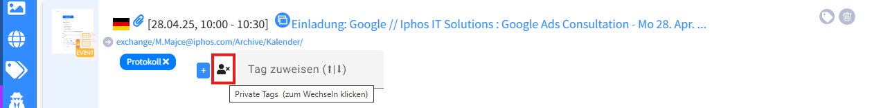 Um Dokumente privat oder öffentlich für alle Mitarbeiter kennzeichnen zu können, haben wir das “Tag-Handling” eingeführt. Durch die Vergabe von Tags, welche auch eine Hierarchie beinhalten können, wird es möglich, bestimmten Dokumenten mehrere Parameter zu geben, um später nach diesen zu suchen und zu filtern. Im Projekt- oder Eventmanagement, im Controlling oder z.B. zur Klassifizierung von Bildmaterial finden manuell vergebene Tags oft Verwendung.