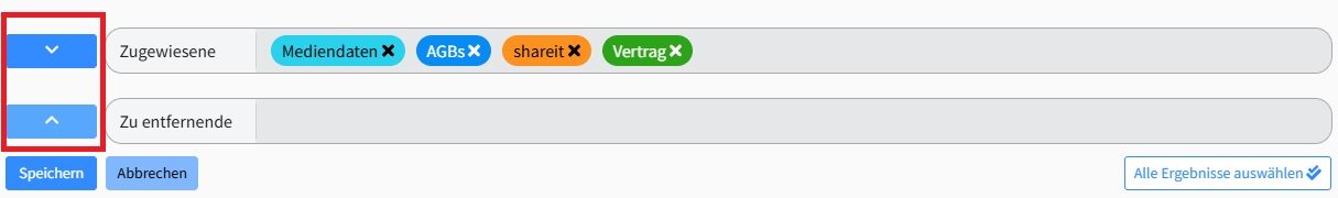 • Oben im Bereich „Tags Entfernen“ sehen Sie alle Tags, die derzeit den ausgewählten Dokumenten zugewiesen sind. Klicken Sie auf ein Tag, um es in die Entfernen-Zeile zu bringen. Haben Sie das falsche erwischt, lässt es sich mit einem Klick wieder in die Zeile mit den zugewiesenen Tags für Ihre Auswahl bewegen.